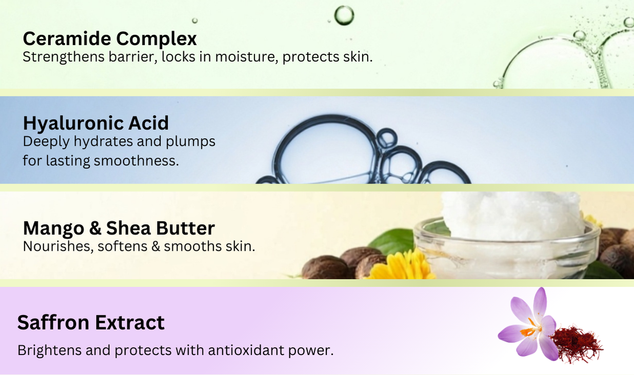 - Deep Nourishment & Hydration – Enriched with Ceramide Complex, Mango & Shea Butter to restore softness and suppleness.