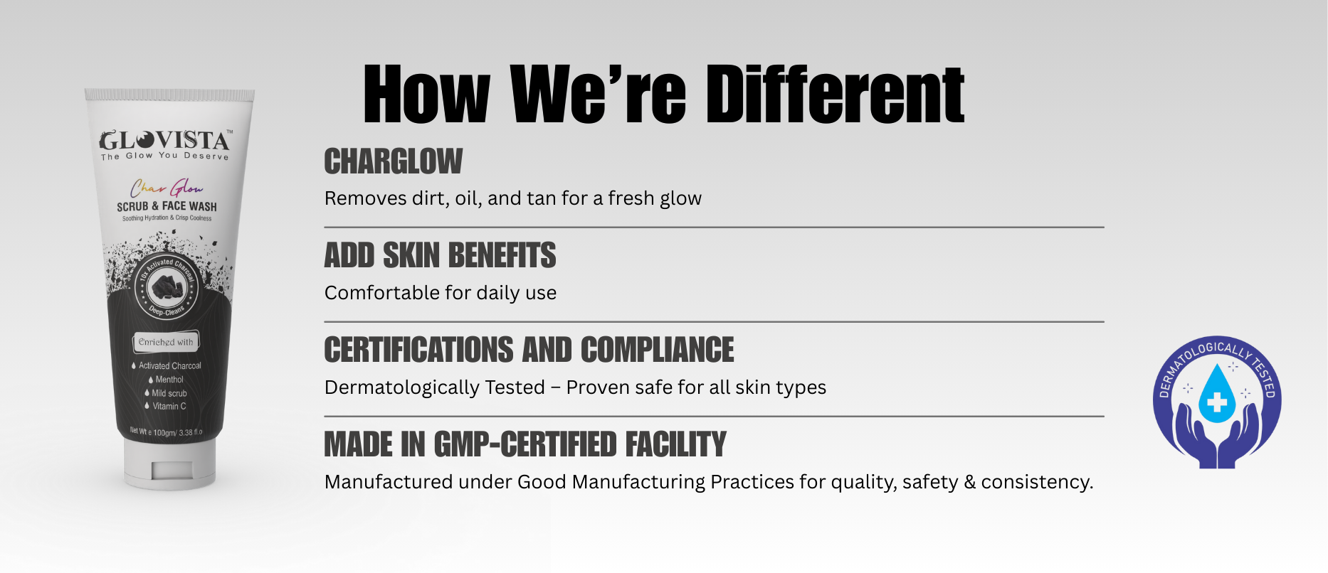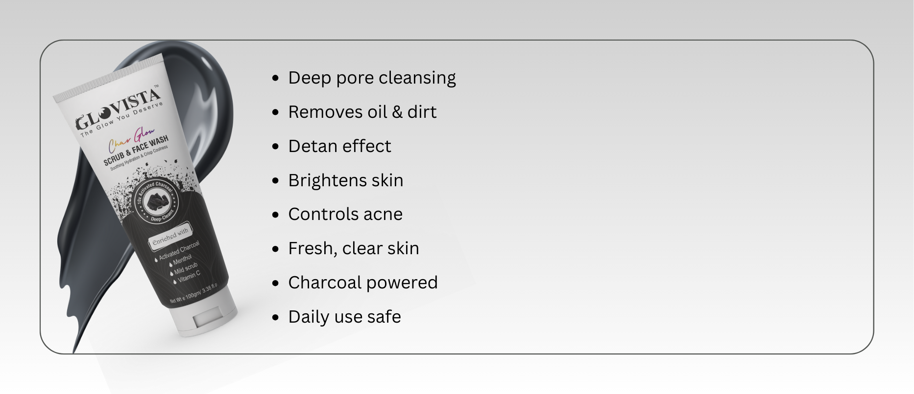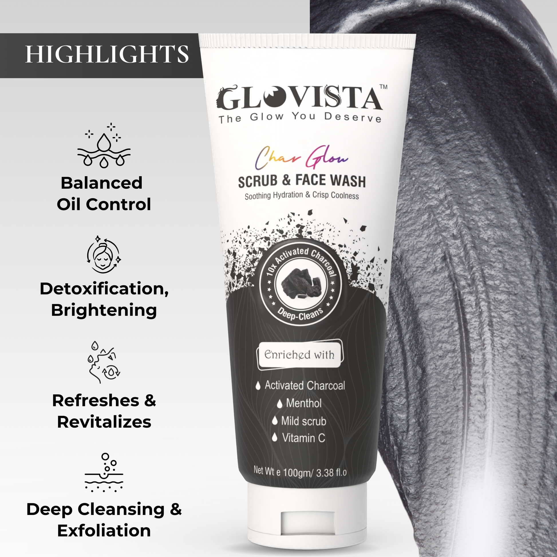 Glovista CharGlow is formulated to target impurities, oil, and pollutants while being gentle enough for daily use. With a unique blend of Charcoal, Vitamin C, Menthol, and Mild Scrub Beads, it clears away dirt, toxins, and dead cells, while boosting radiance and keeping skin energized.
