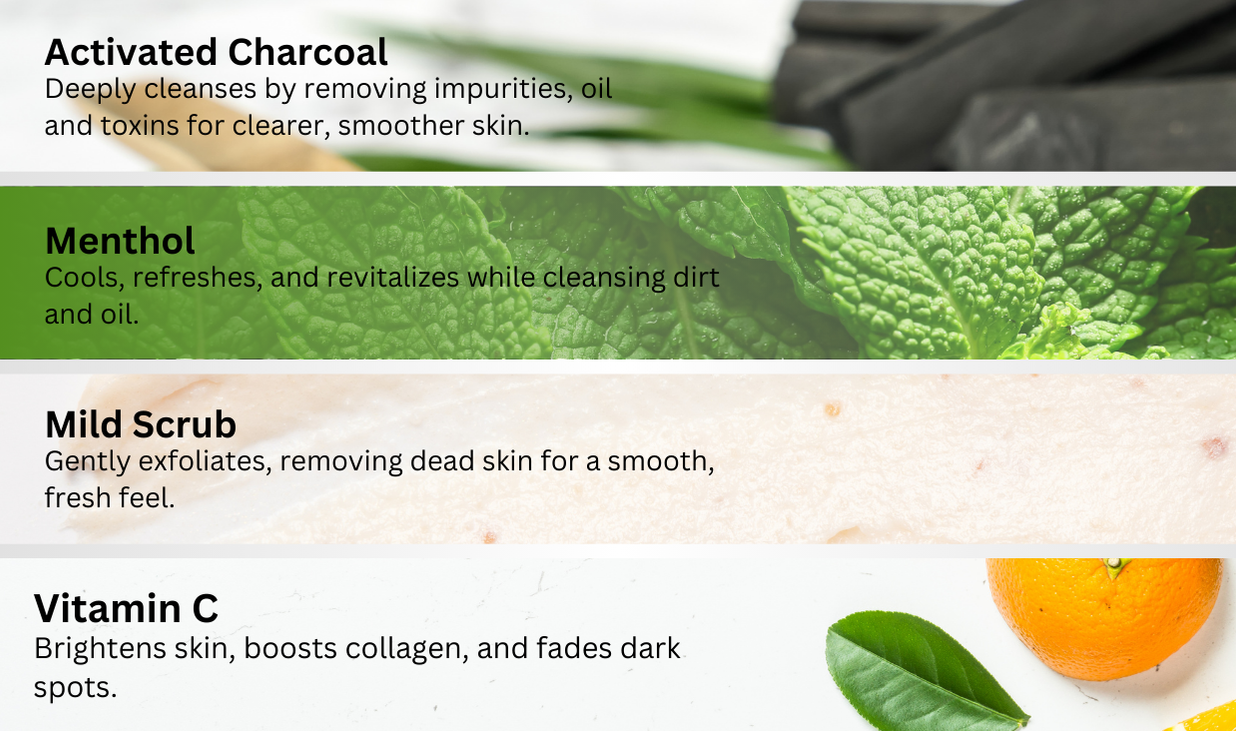 Dual-action face wash with Charcoal, Vitamin C, Menthol and gentle beads that unclog pores, remove oil, polish dead cells, and leave skin cool, bright, and refreshed.