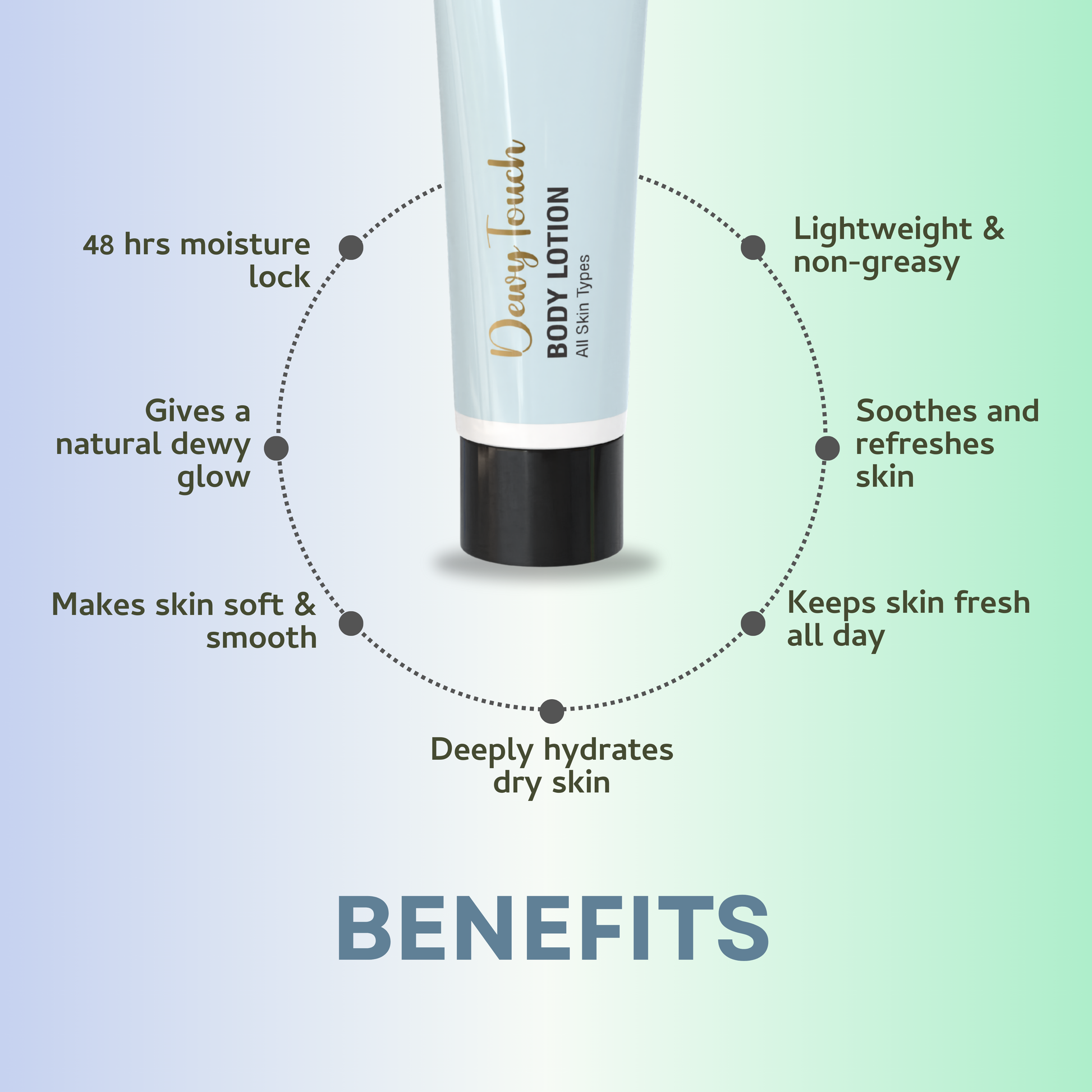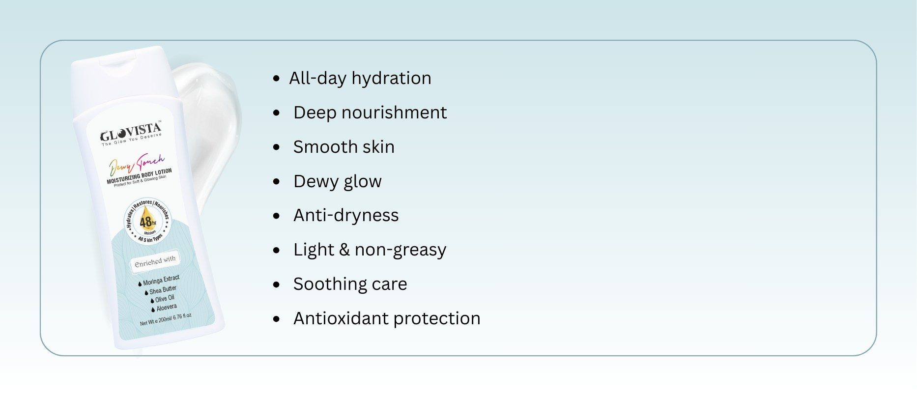 Dewy Touch – Daily Body Lotion (25g) is a lightweight, fast-absorbing lotion designed to keep your skin moisturized, smooth, and comfortable throughout the day. This mini trial pack is perfect for first-time users, travel, and skincare hampers.