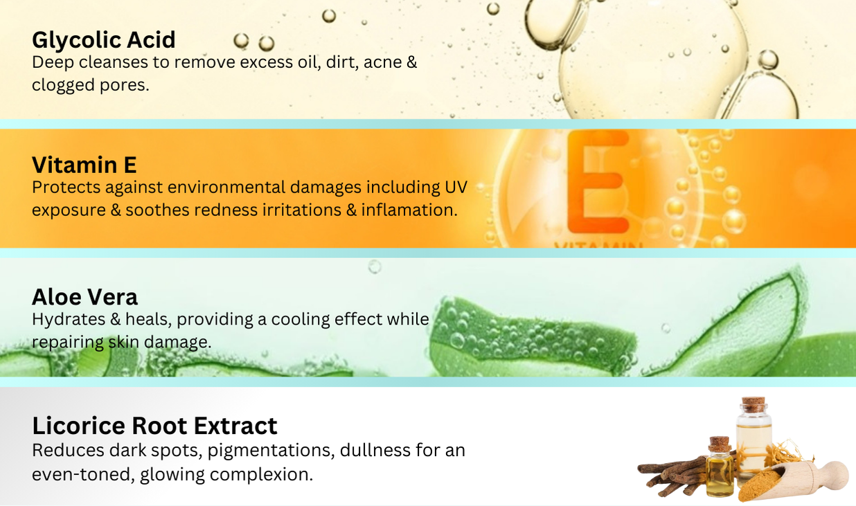 - Gentle foaming face wash with Glycolic Acid, Aloe Vera & Licorice Extract