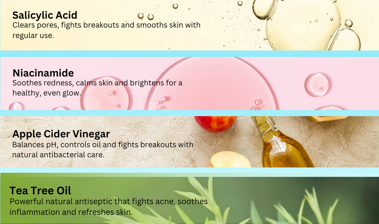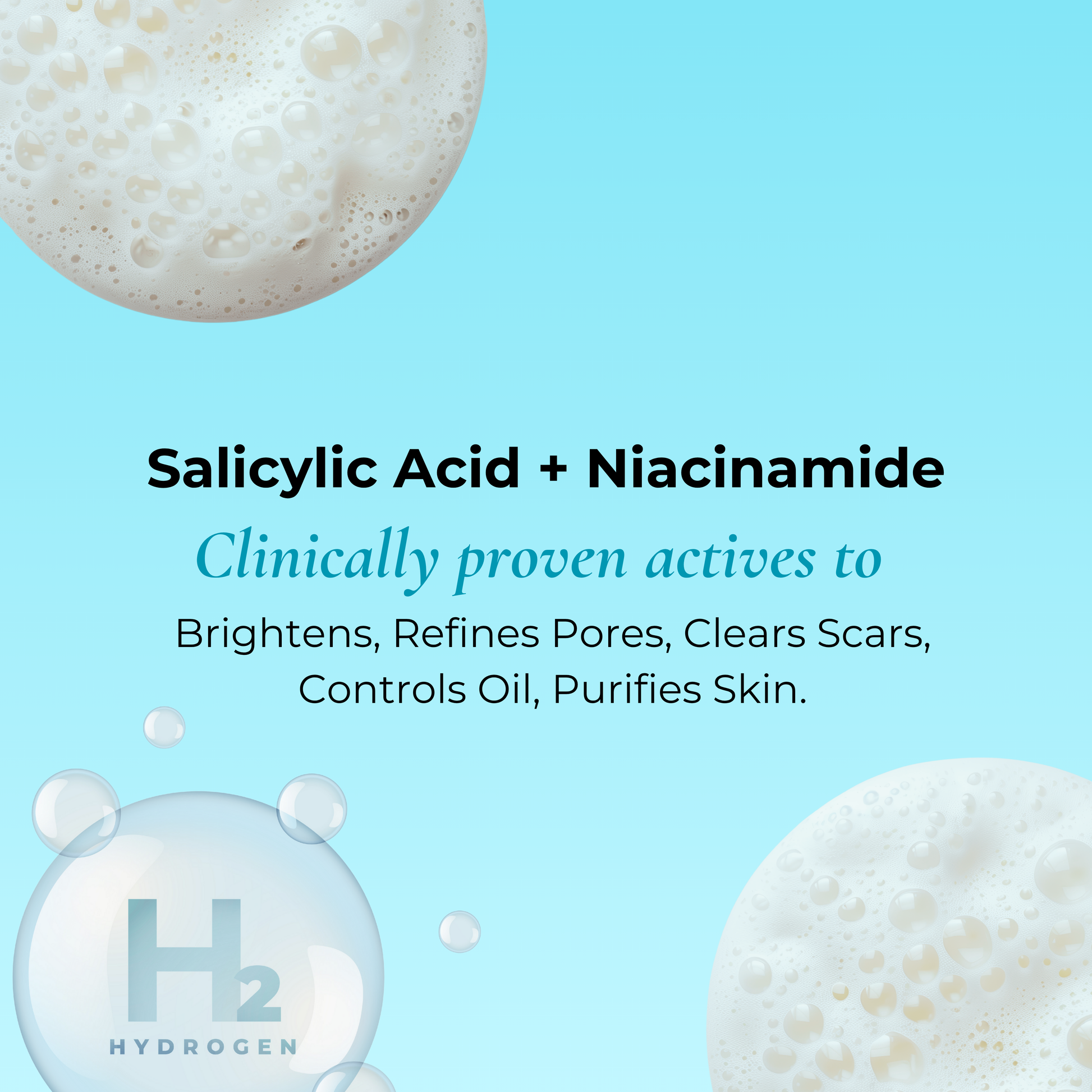 Foaming cleanser with Salicylic Acid, Niacinamide, ACV & Tea Tree that clears pores, controls oil, prevents breakouts, and leaves skin fresh.