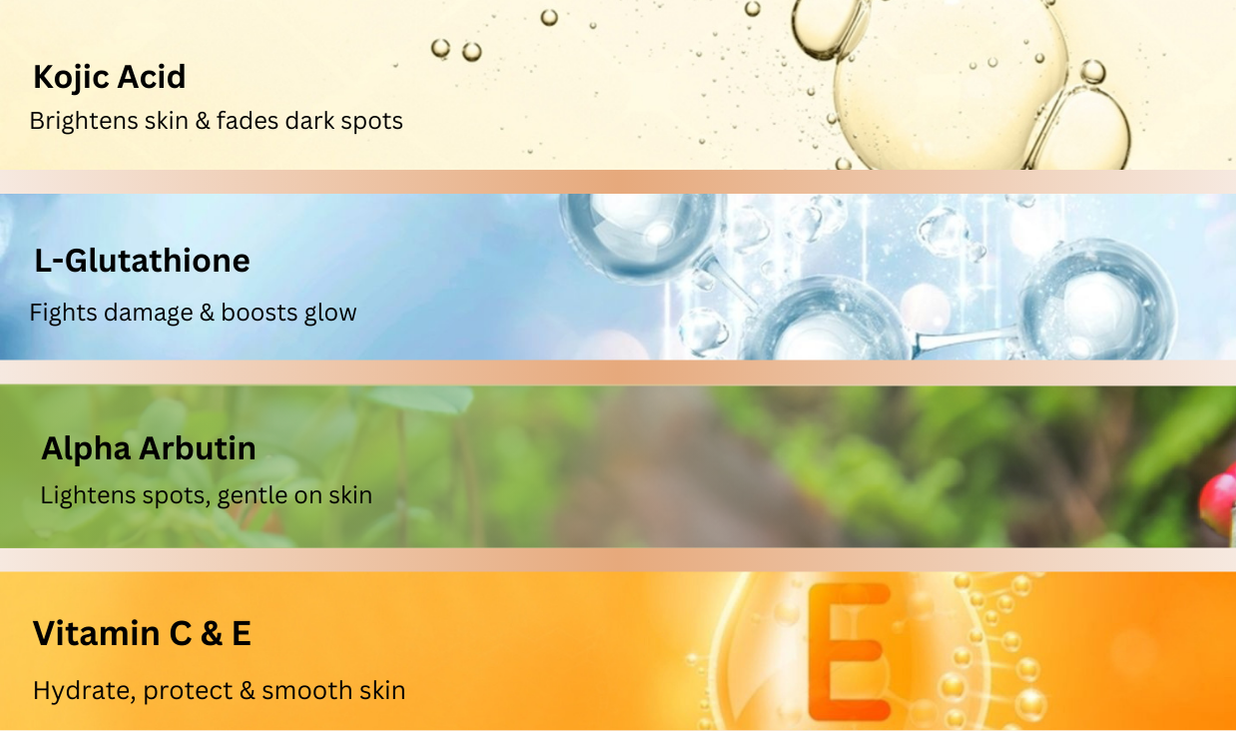 - Kojic Acid: Brightens uneven skin tone and helps fade dark spots for a clearer complexion.